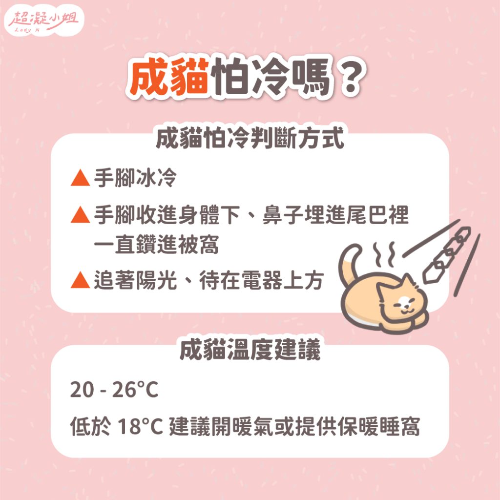- 核心觀念: 貓咪正常體溫約 38-39°C,比人類高,當室溫低於 20°C 時,牠們就會開始感到寒意。