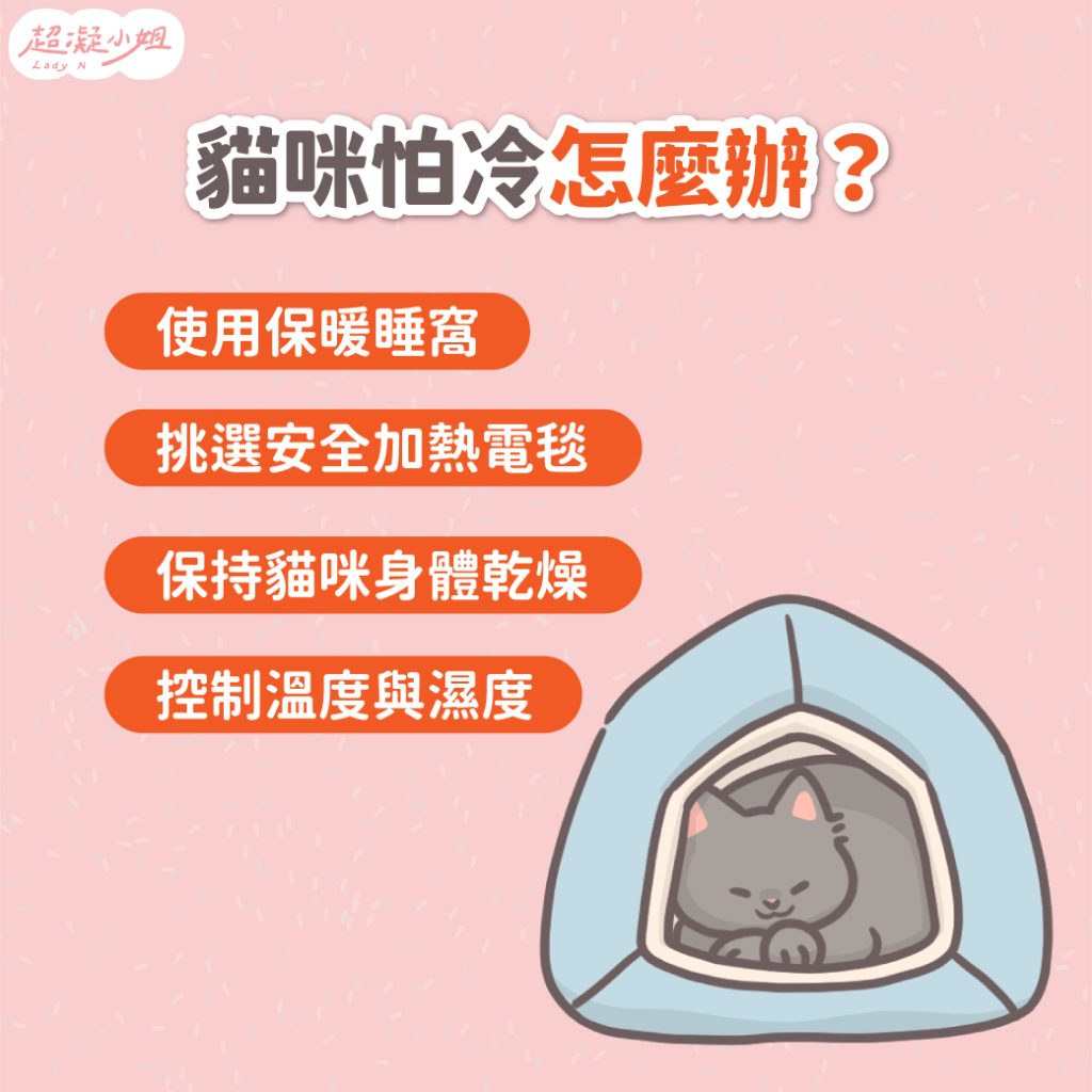 - 保暖重點: 推薦使用寵物專用電暖墊或包覆式睡窩;切勿讓貓咪直接接觸暖暖包,以免低溫燙傷。