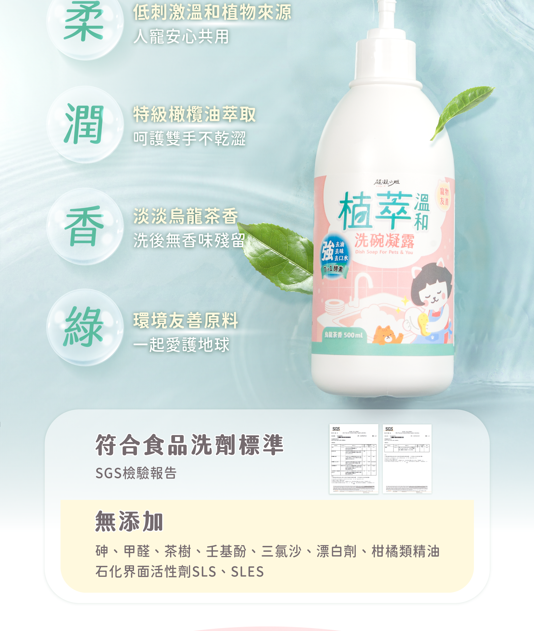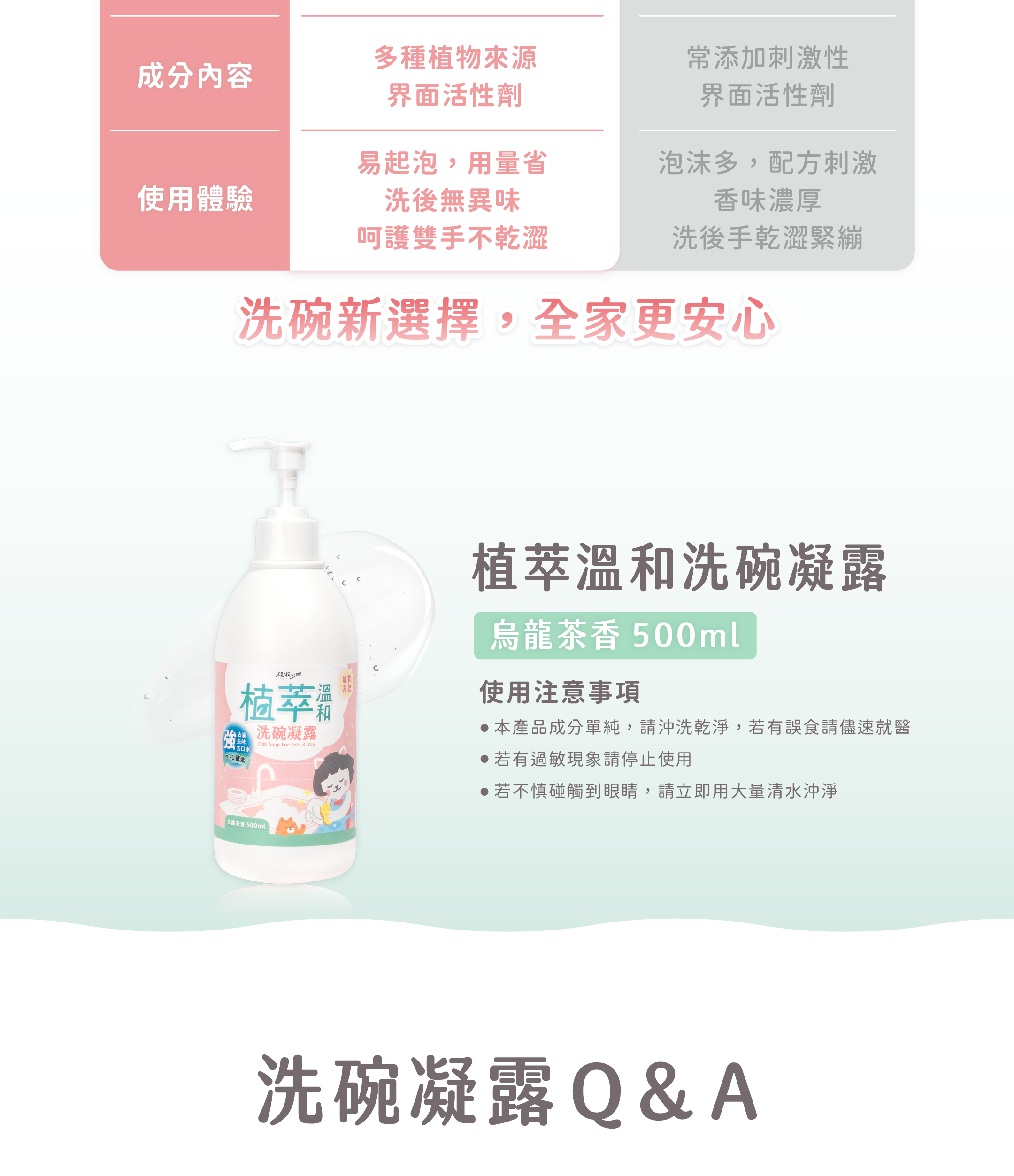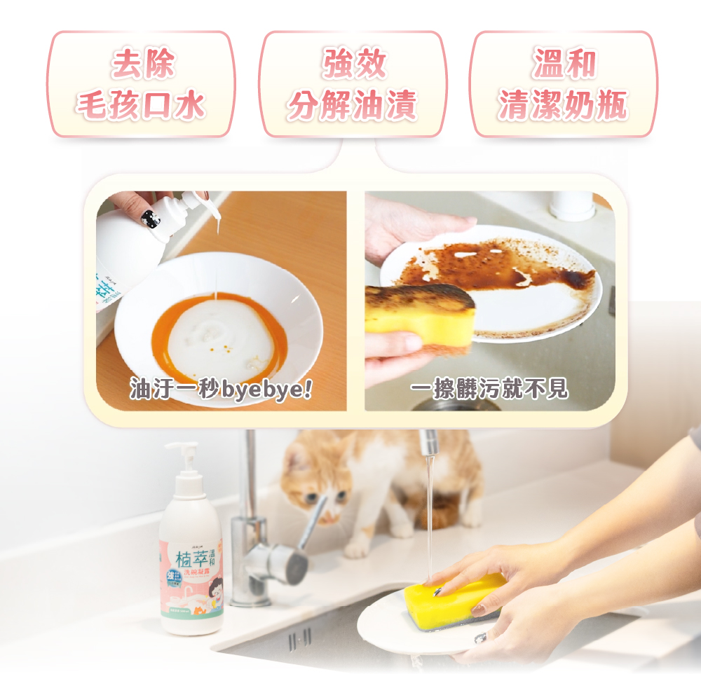▸ 一瓶真正能人寵共用的洗碗精 ▸ 溫和植物成分,一瓶全家安心用 ▸ 分解深層油汙,一沖潔淨肌膚不乾澀 ▸ 毛孩口水、油汙碗盤、嬰兒奶瓶都適用 ▸ 療癒烏龍茶香,洗後無味零殘留
