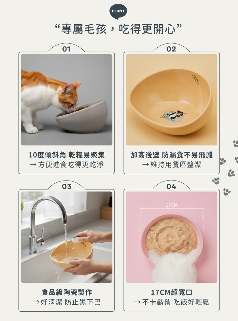 • 舒適進食角度:碗面微傾斜,減少低頭壓力,幼齡、成齡、熟齡都好用。