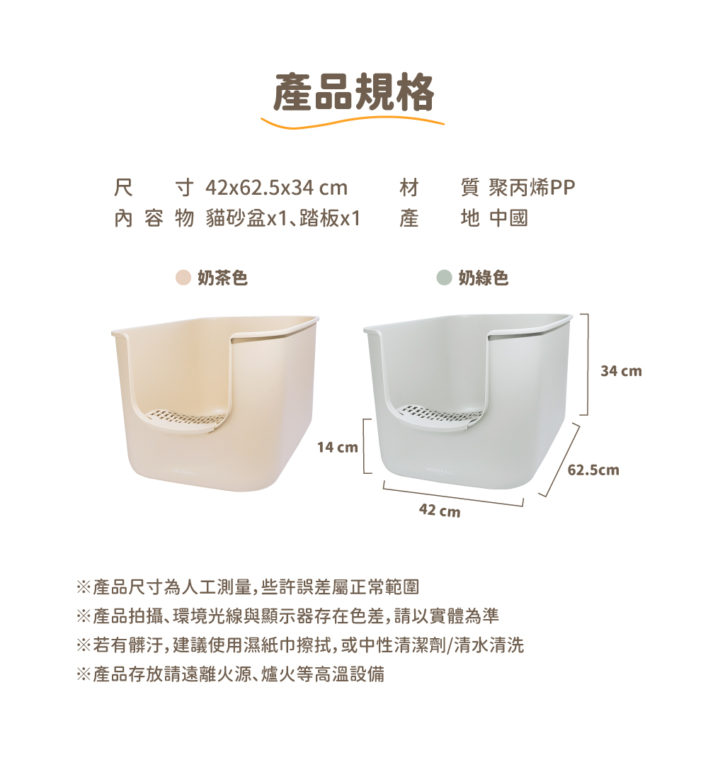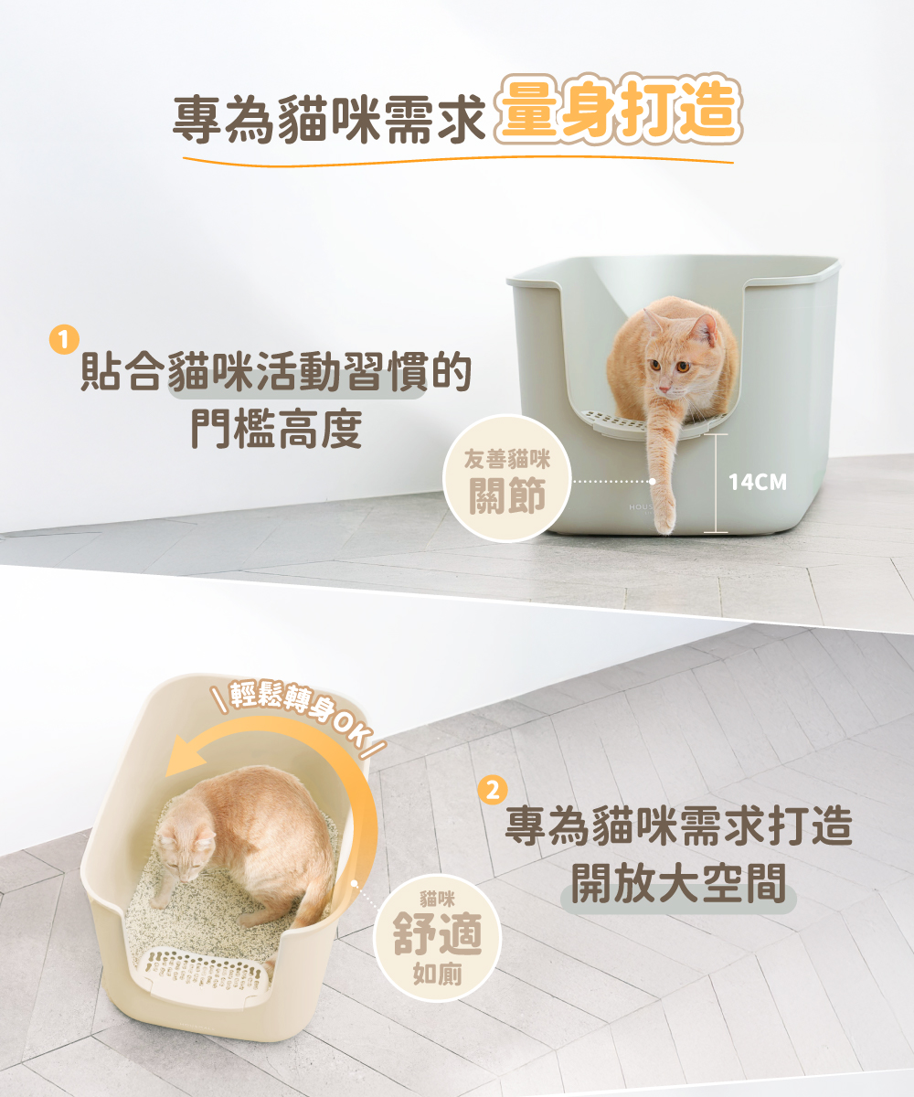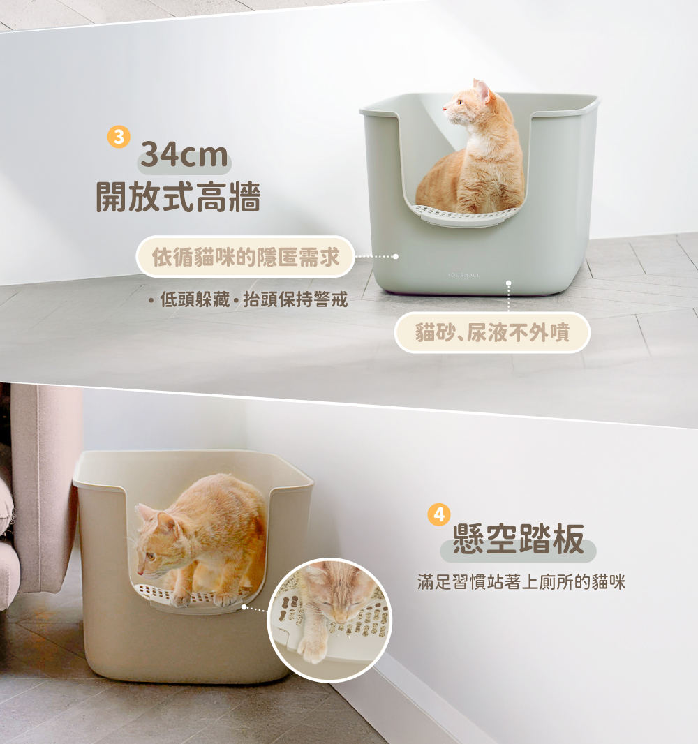 • 剛好的門檻高度,友善毛孩關節 • 舒適如廁大空間!能轉身不壓迫、不將味道悶住 • 34cm開放式高牆,滿足貓咪警戒躲藏需求,貓砂尿液不外噴 • 懸空踏板,滿足習慣站著上廁所的貓